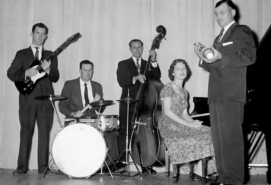 Cutt Barfied Orchestra in Vicksburg, MS. Tommy Bishop, guitar, Ed McCleve, drums, John Martin, bass. Eva Dot Ryan Barfield, Cutt’s wife, piano and Cutt Barfield, trumpet. (The picture was provided by Ed Cummins, who, with his brother Pickett, played saxophones with the Barfield Orchestra.)